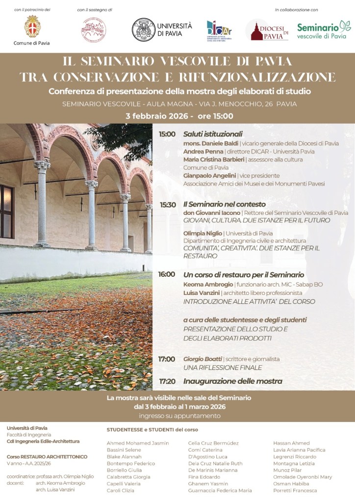 Nel contesto di straordinaria bellezza del Monastero di Santa Maria Teodote, sede del nostro seminario, a partire dal mese di ottobre 2025 si sono svolte le lezioni del corso di Restauro architettonico, corso di Laurea in Ingegneria Edile e Architettura dell’Università di Pavia. Il corso è coordinato dalla professoressa Olimpia Niglio e ha avuto come docenti per la…