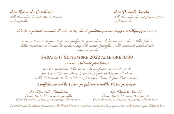 Ordinazioni Presbiterali: il 17 Settembre 2022 Don Riccardo Cambisio e don Daniele Sacchi Sacerdoti per la Chiesa pavese Pubblicato dadgiacomoravizzahotmailcom15 agosto 202219 agosto 2022Pubblicato in: Senza categoria ______________ Condividi: Condividi su X (Si apre in una nuova finestra) X Condividi su Facebook (Si apre in una nuova finestra) Facebook Mi piace Caricamento... Correlati