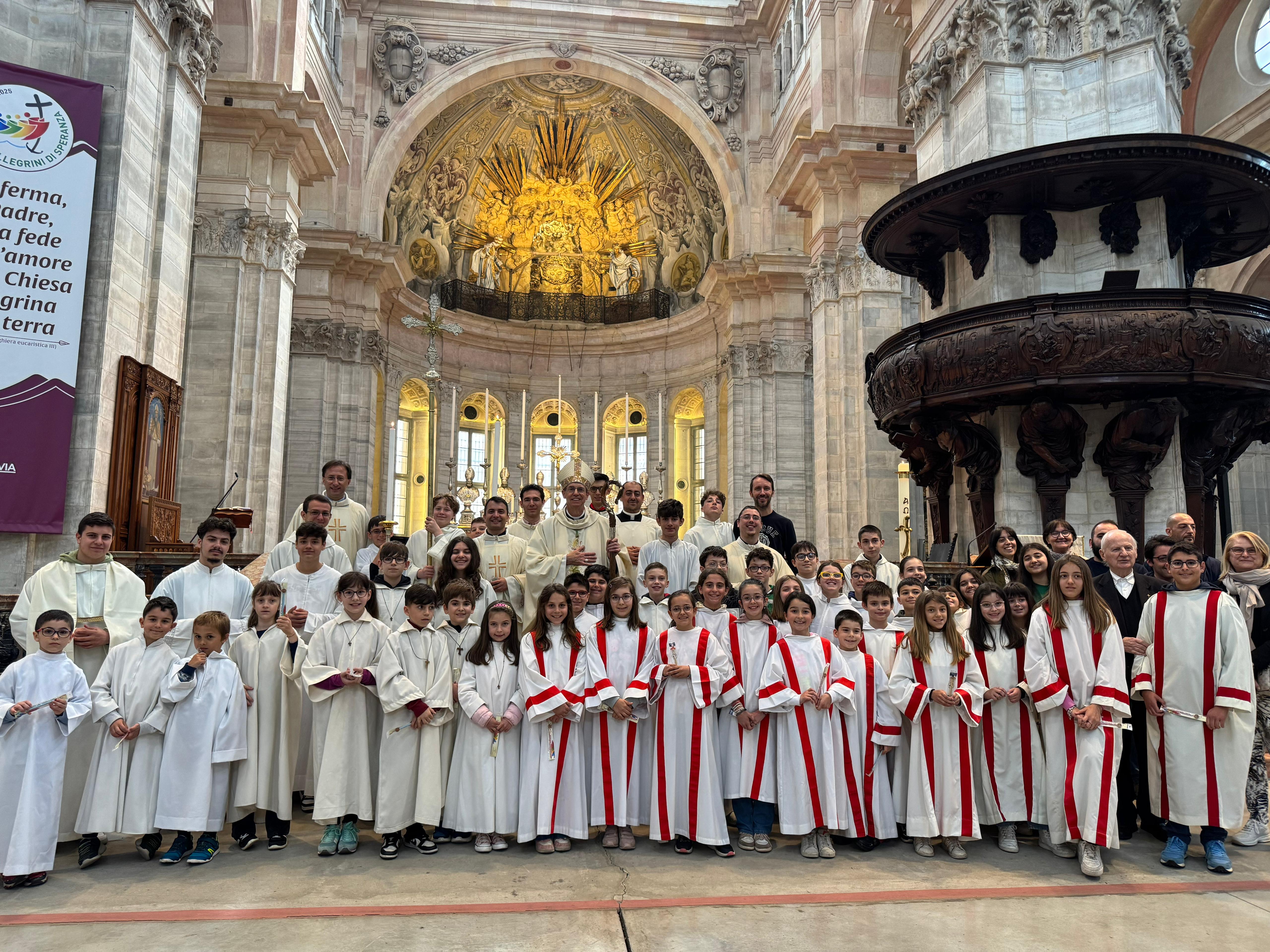 Con tutti ci siamo ritrovati la mattina in duomo, dove il vescovo ha guidato un percorso giubilare a tappe all’interno dello stesso duomo, a partire dal fonte battesimale, passando per l’altare dell’Immacolata, del Santissimo e del Crocifisso, fino a quello di San Siro. Quindi il vescovo ha presieduto la Celebrazione eucaristica, intrattenendosi a dialogare coi ragazzi durante l’omelia, nella quale ha ricordato: “Facendo i chierichetti fate un servizio bellissimo a Gesù e alla comunità cristiana! E questo servizio non finisce con la Messa, ma continua nel modo di stare a casa, con papà e mamma, tra di voi, con gli amici!”. Al termine della celebrazione, che è stata animata dalla corale delle parrocchie di Vellezzo e Giovenzano, il vescovo ha donato ai chierichetti un segno a ricordo del Giubileo.