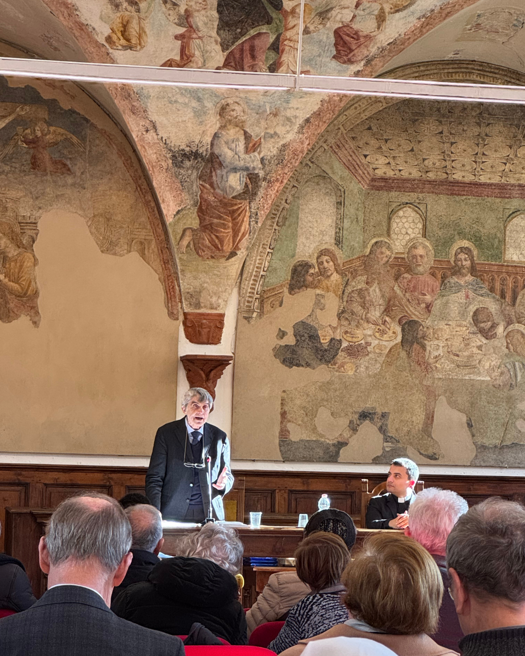 La mattina è proseguita, in Aula Magna, con l’intervento dell’architetto Luigi Leoni a ricordo di padre Costantino Ruggeri, nel centenario della nascita. Padre Costantino è stato un artista e frate francescano vissuto per molti anni nel convento di Canepanova a Pavia. In collaborazione con Luigi Leoni ha ideato e realizzato numerose chiese e opere d’arte sacra in Italia e nel mondo. Il ritratto delineato dall’architetto Leoni ci ha mostrato chiaramente come la dimensione vocazionale e spirituale della vita di padre Costantino si sia inserita perfettamente nella sua professionalità di artista e, anzi, l’abbia valorizzata significativamente.