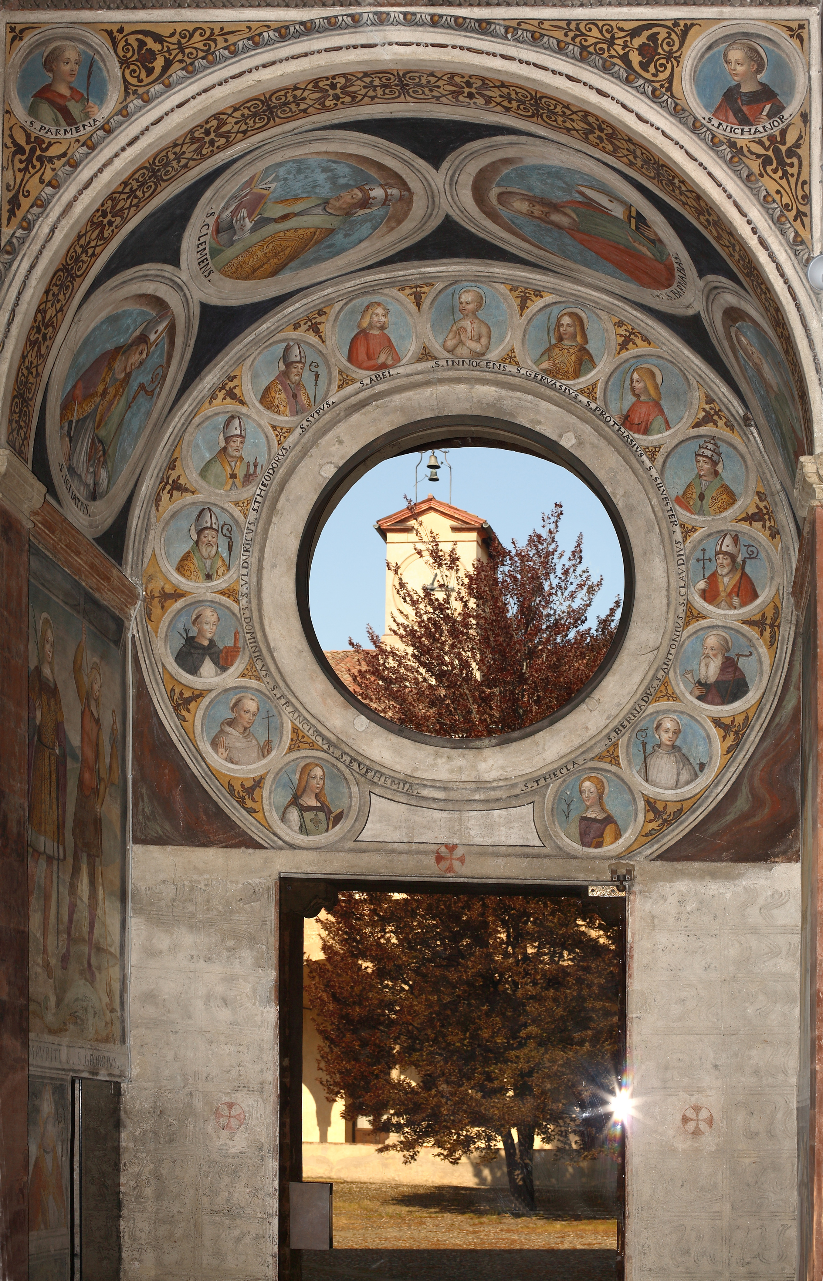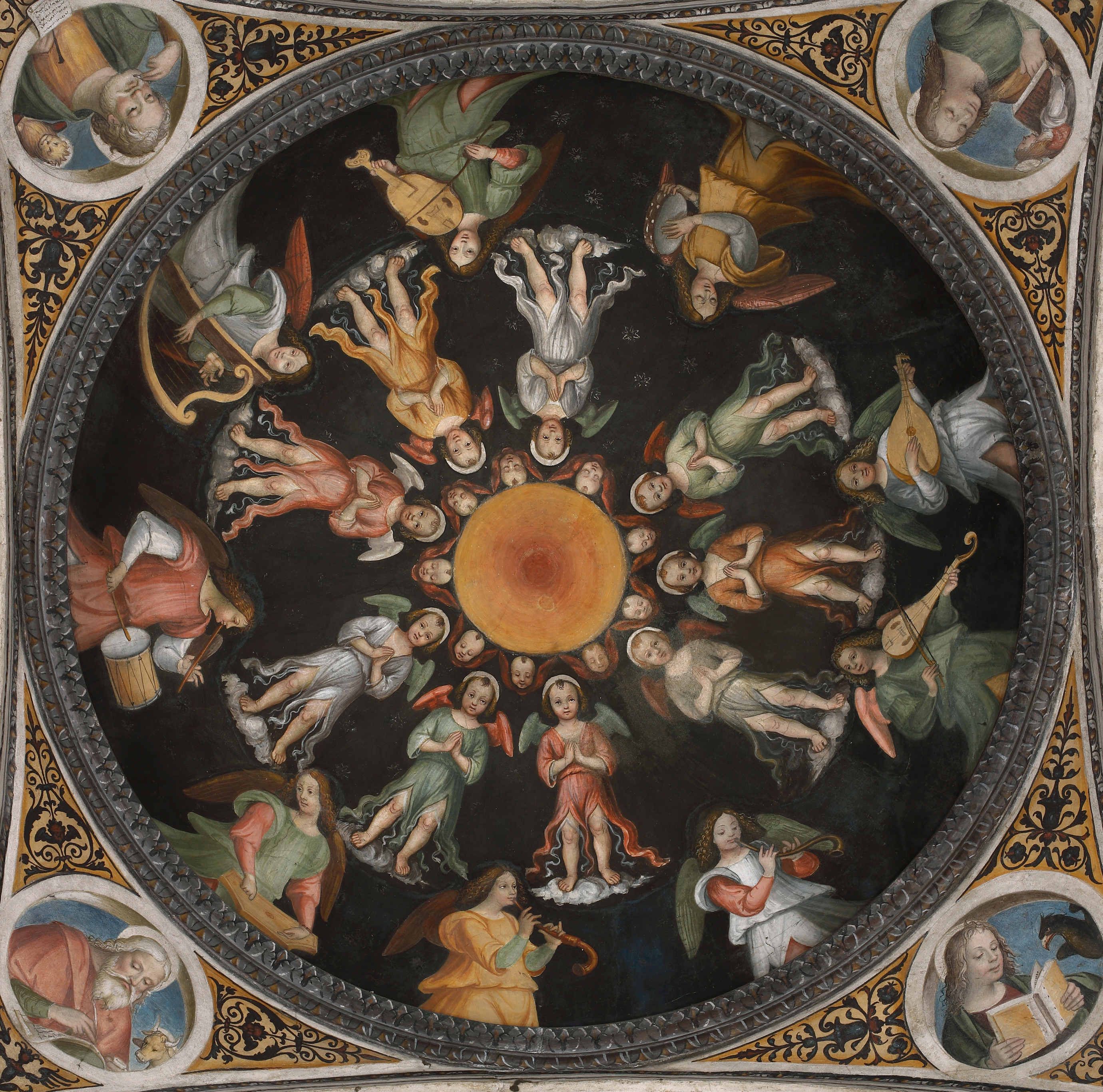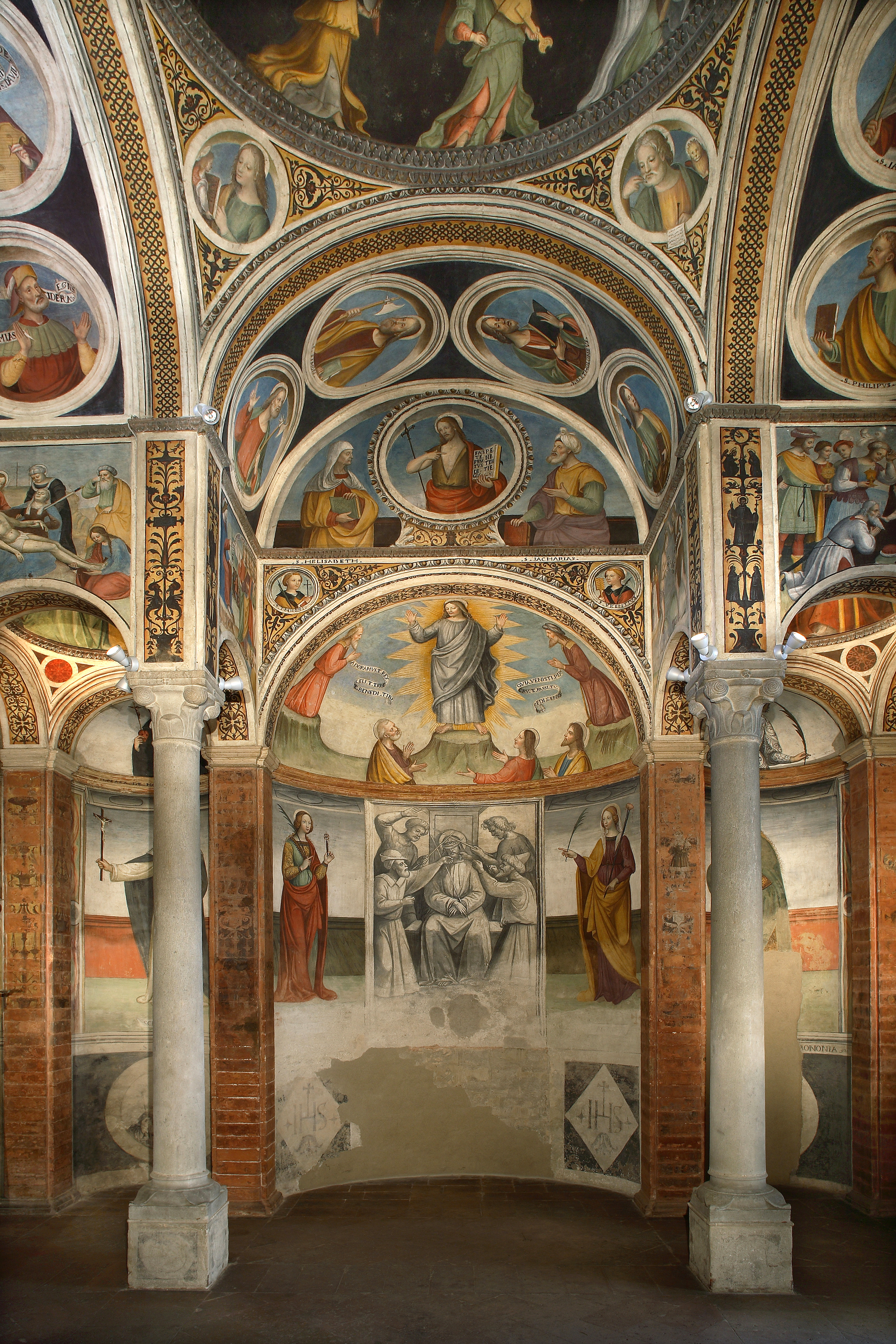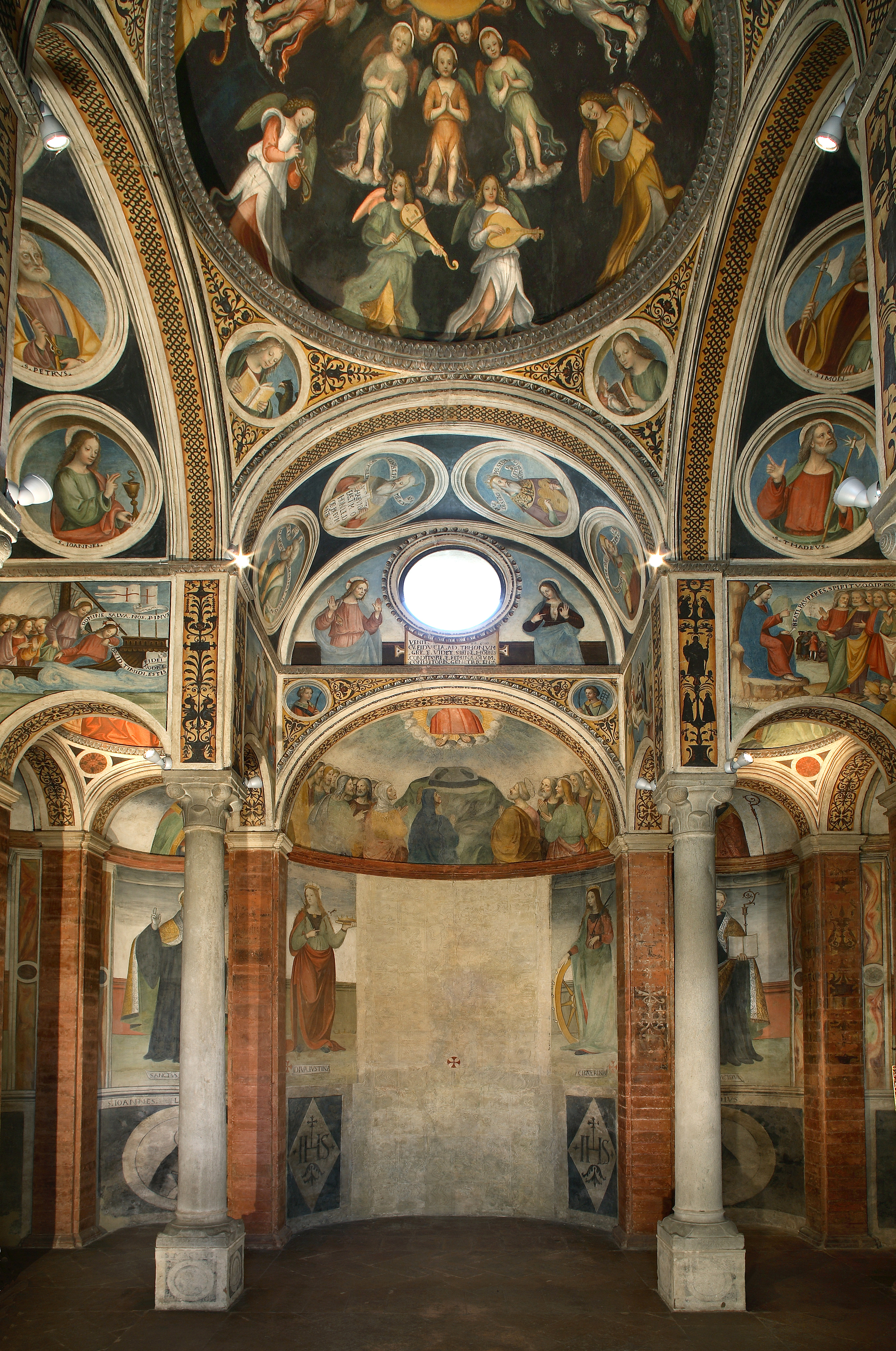 The precious frescoes that adorn the interior of the chapel are almost unanimously attributed to Bernardino Lanzani from San Colombano (1460–c. 1530), his workshop, and the Master of the Stories of Saint Agnes (active in Pavia c. 1506–1530). Bernardino Lanzani is likely responsible for the design and execution of the frescoes in the central dome, featuring Angels Playing Music, the roundels with the Evangelists, the vaults with figures of Apostles and Saints, the three main apsidal lunettes depicting the Resurrection, the Ascension, and the Transfiguration, as well as the smaller domes representing the Doctors of the Western Church.