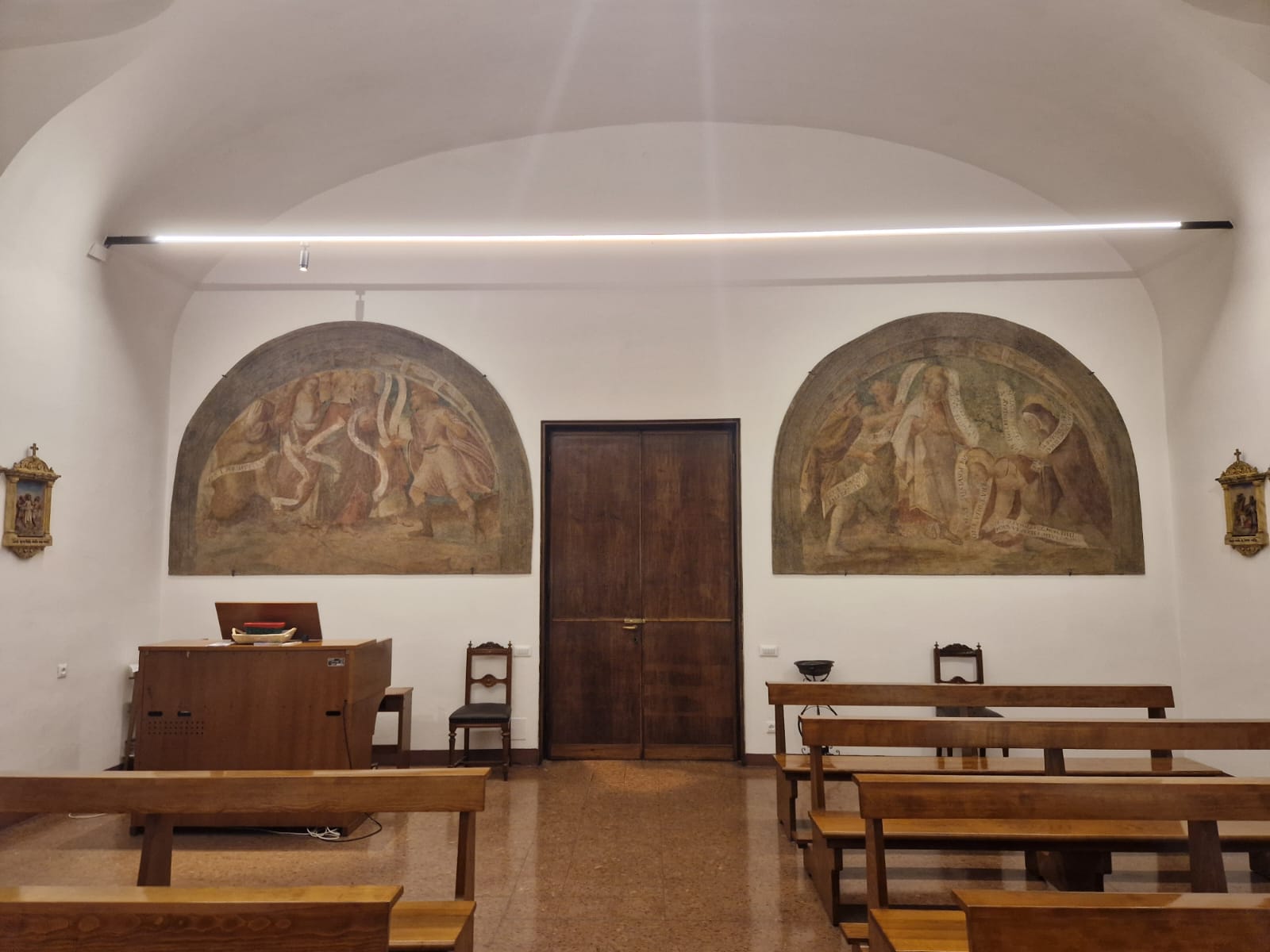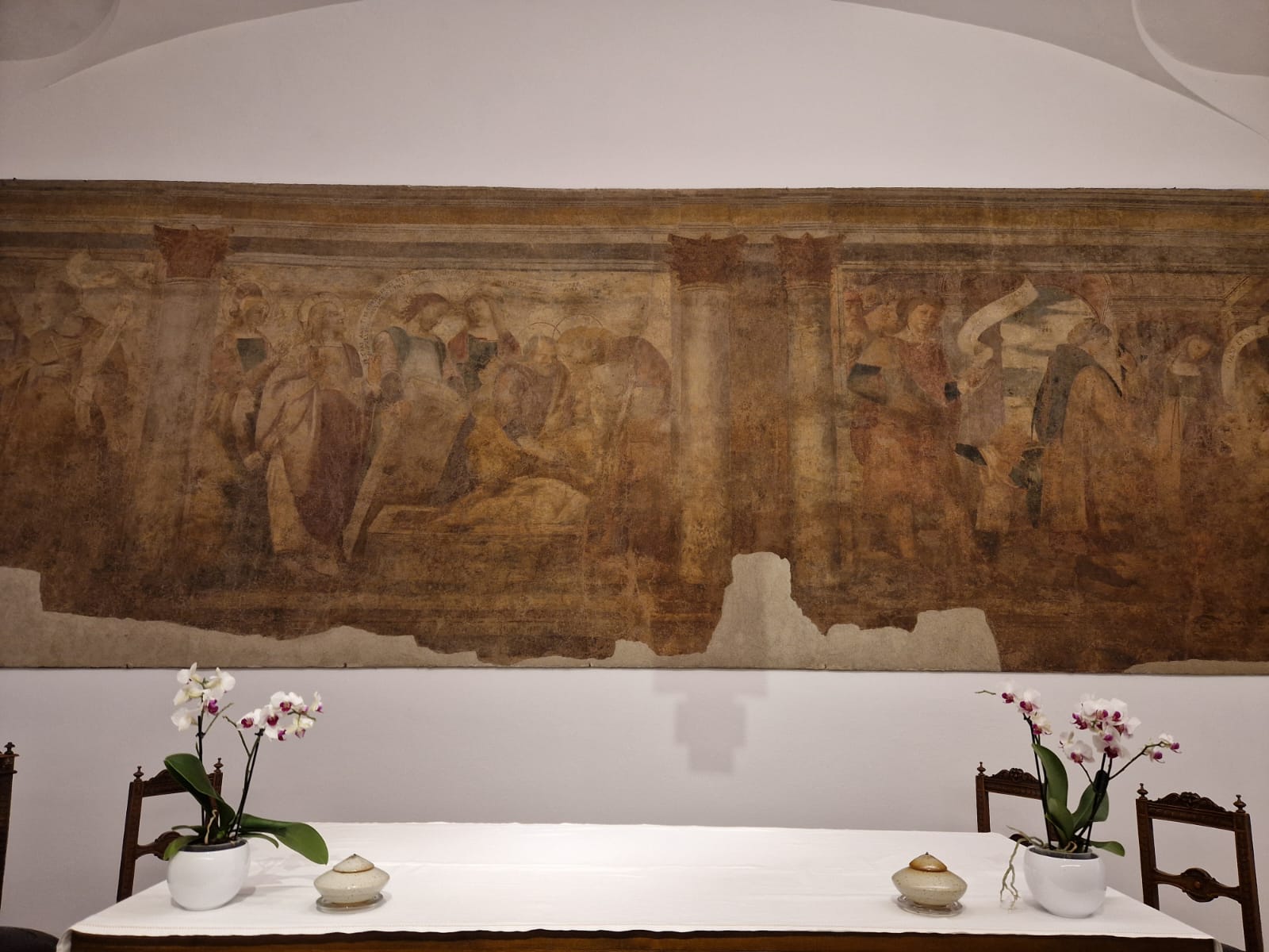 The original decoration and furnishings are lost: on the walls, there are detached frescoes, removed from the eastern portion of the cloister for conservation reasons. Through the ribbons with inscriptions, one can recognize the episode – depicted in several scenes – of the healing of the crippled man by Saints Peter and John, as well as several scenes related to the miracle of the Resurrection of Lazarus.