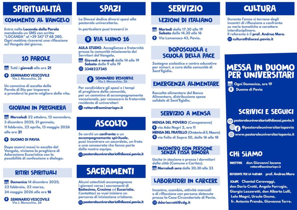 Strettamente connesso alla vita del Seminario è il Servizio diocesano di pastorale dell’università e della cultura, del quale è direttore lo stesso rettore, don Giovanni Iacono. Nella progettualità della Diocesi, il Seminario, dove già alcuni universitari condividono una vita fraterna e di preghiera, diverrà la sede della Pastorale universitaria, con la creazione di alcuni spazi di accoglienza e di servizi per gli universitari. Per partecipare ai tempi di preghiera della comunità, per iniziare un cammino di accompagnamento vocazionale o per conoscere la fraternità universitaria che vive in Seminario, scrivi a rettore@seminariopv.it o pastoraleuniversitaria@diocesi.pavia.it, seguici su https://www.instagram.com/pastoraleuniversitariapavia/.
